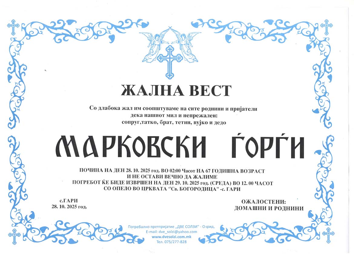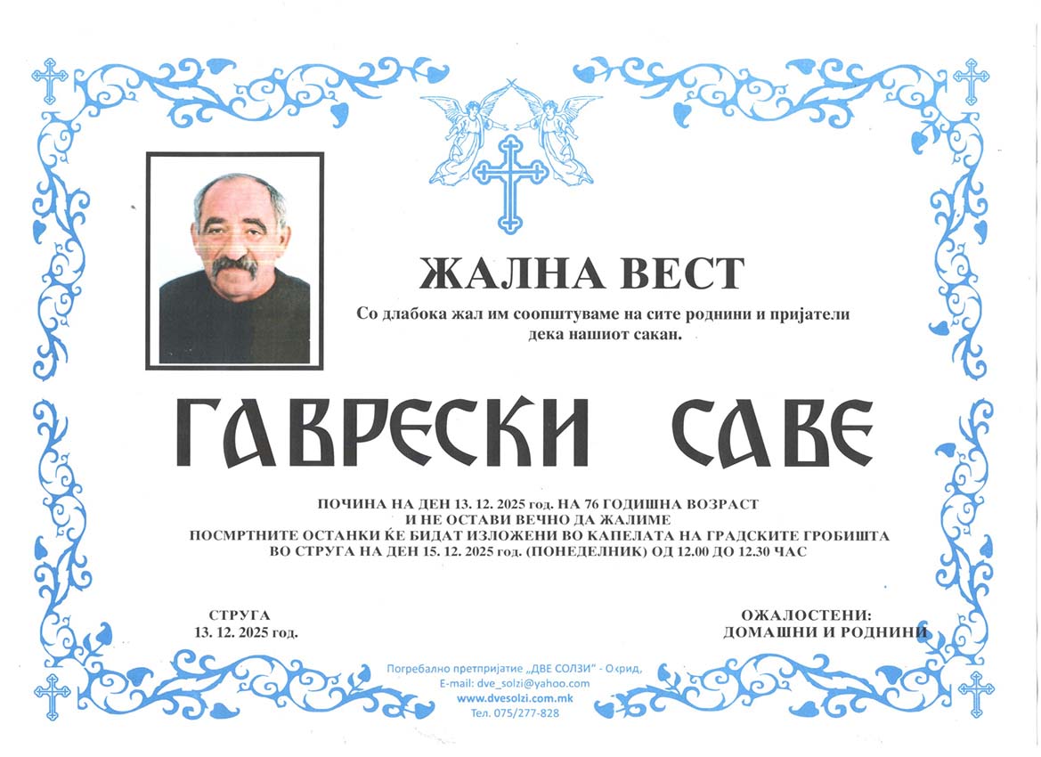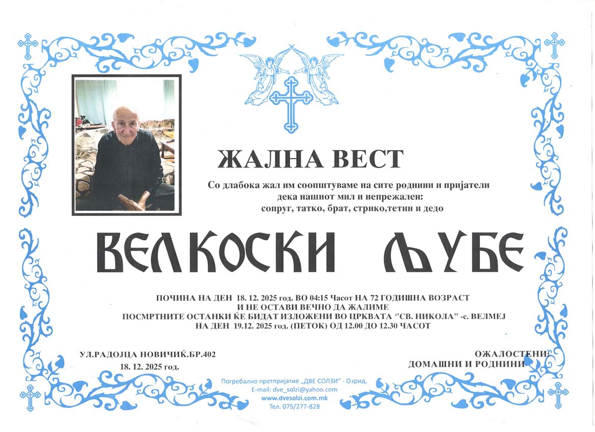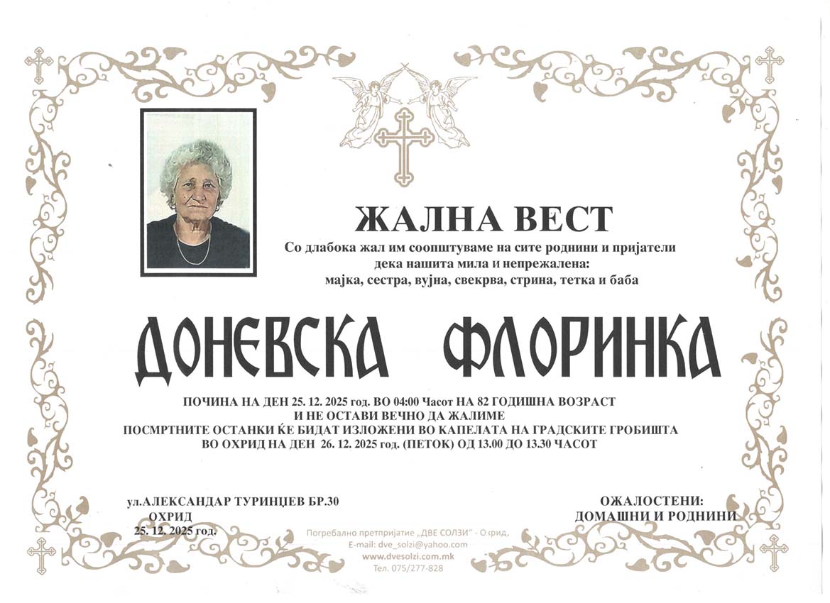 Погребално Претпријатие (Оператор на погребални услуги),,  ДВЕ СОЛЗИ – ОХРИД,,  вршиме продажба на погребална опрема , лиценциран превоз на покојни со специјални погребални возила од сите болници и други установи во и надвор од државата , капела (00-24) часа , целосна тоалета на покоен. Ви нудиме најдостапни цени , огромен избор на погребална опрема ,бесплатна достава до вашиот дом, услуги на врвно ниво, долгогодишно искуство .