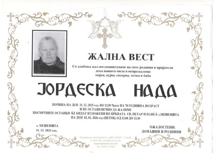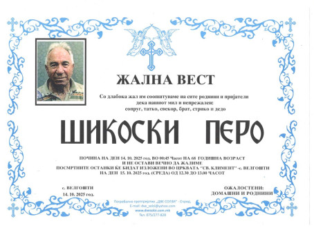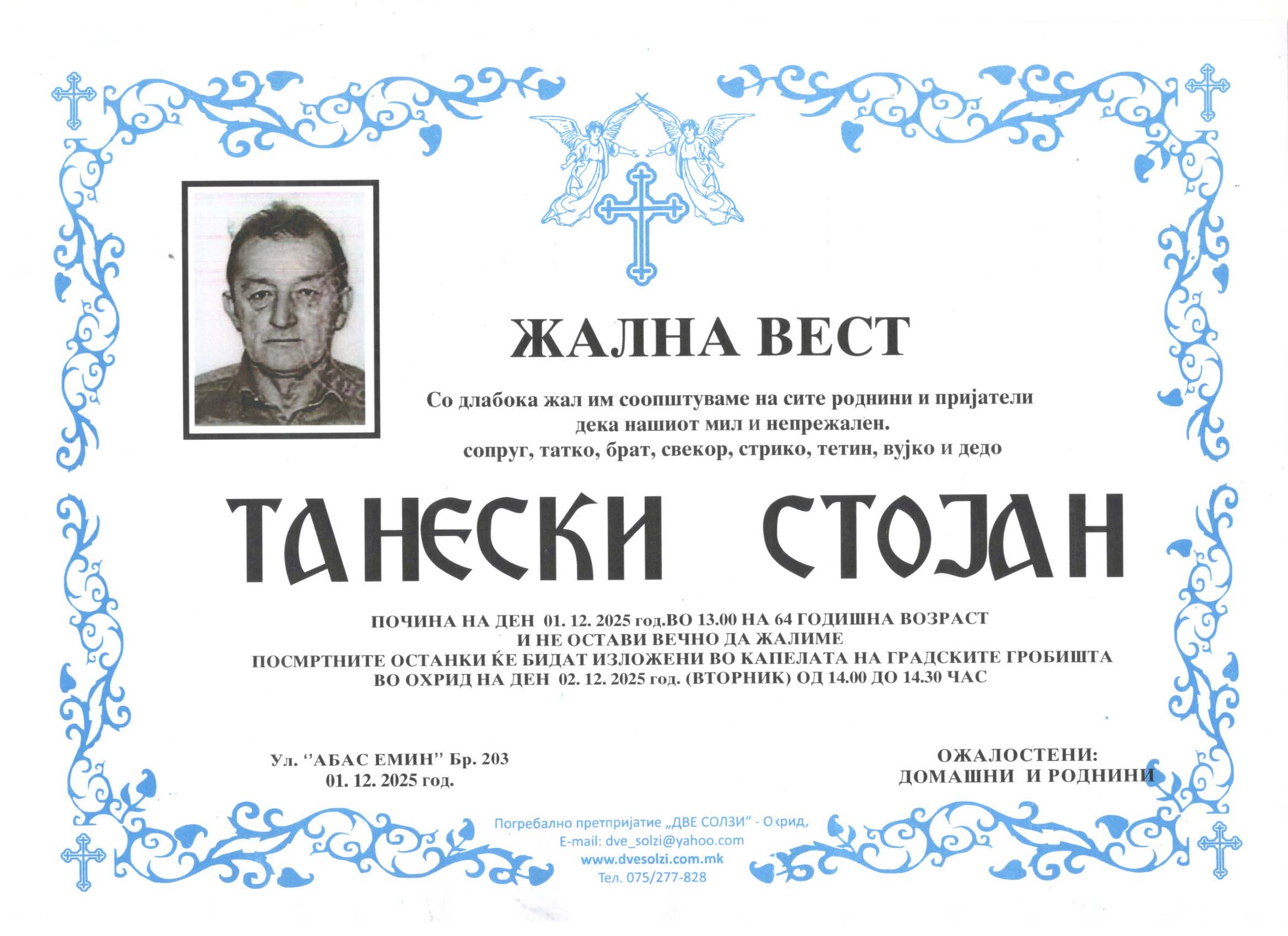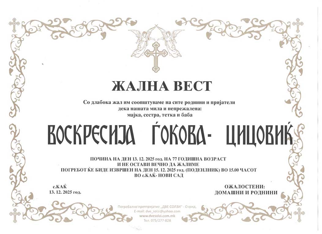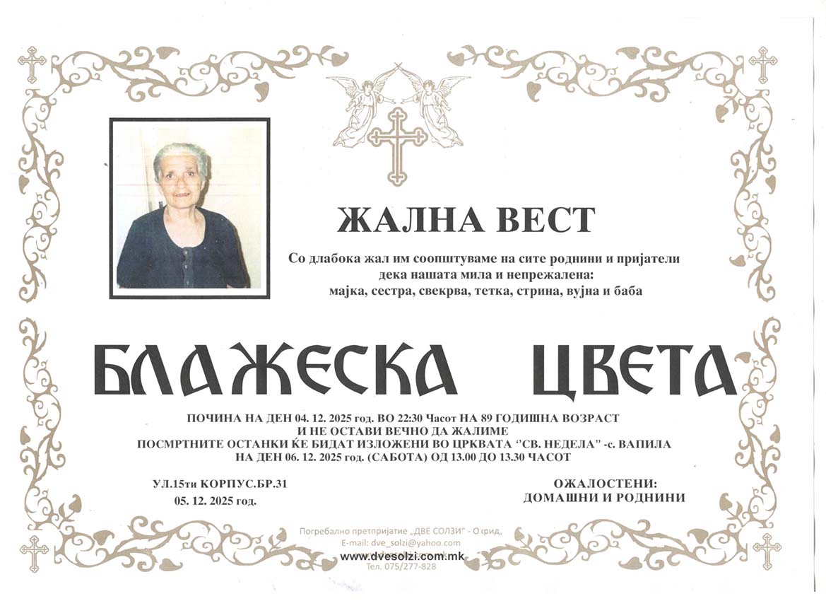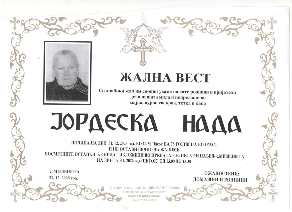 Погребално Претпријатие (Оператор на погребални услуги),,  ДВЕ СОЛЗИ – ОХРИД,,  вршиме продажба на погребална опрема , лиценциран превоз на покојни со специјални погребални возила од сите болници и други установи во и надвор од државата , капела (00-24) часа , целосна тоалета на покоен. Ви нудиме најдостапни цени , огромен избор на погребална опрема ,бесплатна достава до вашиот дом, услуги на врвно ниво, долгогодишно искуство .